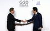 【오사카(일본)=뉴시스】박진희 기자 = 문재인 대통령이 28일 일본 오사카 국제컨벤션센터 인텍스오사카에서 열린 G20 정상회의 공식환영식에서 아베 신조 일본 총리와 악수하고 있다. 2019.06.28. pak7130@newsis.com |