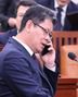 김연철 통일부 장관이 17일 오후 국회에서 열린 외교통일위원회 국정감사에 참석해 전화를 받고 있다. <사진=연합뉴스> |