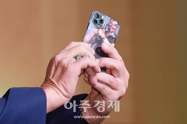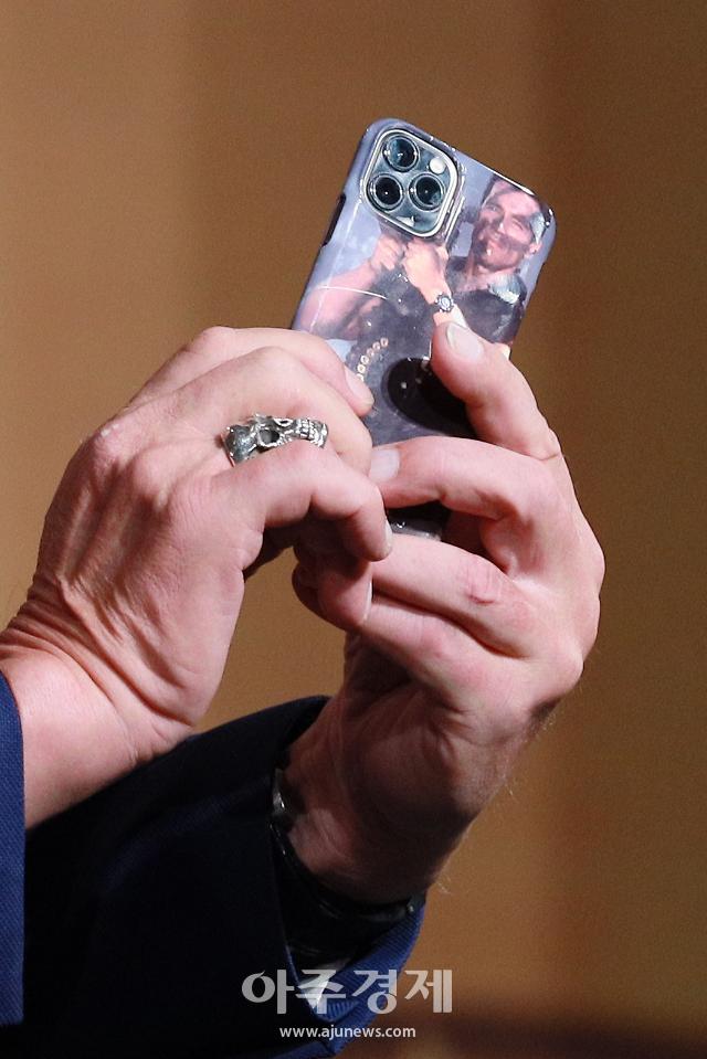 이날 아놀드 슈왈제네거의 아이폰 11 pro 스마트폰에는 영화 '코만도'의 스틸컷으로 제작된 케이스가 있어 눈길을 끌었다.