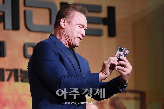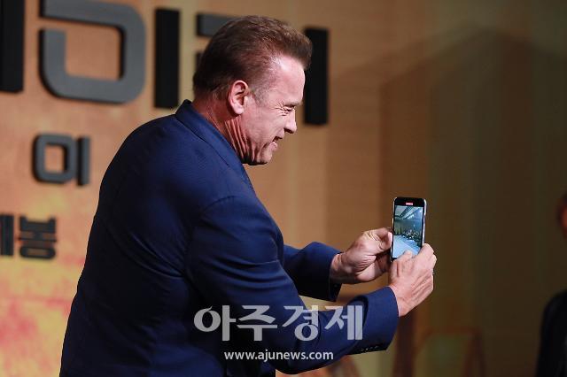 헐리우드 배우 아놀드 슈왈제네거(Arnold Schwarzenegger)가 21일 서울 종로구 포시즌스 호텔 서울에서 열린 영화 '터미네이터 : 다크 페이트' 내한 기자회견에 참석해 스마트폰으로 영상을 촬영하고 있다.