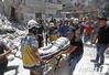 화이트헬멧 소속 대원들이 시리아 이들리브 지역에서 부상당한 민간인을 병원으로 옮기고 있다. <자료사진> © AFP=뉴스1 |