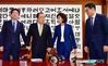 【서울=뉴시스】이종철 기자 = 30일 서울 여의도 국회에서 열린 국회의장과 3당 교섭단체 원내대표 회동에서 왼쪽부터 더불어민주당 이인영 원내대표, 문희상 국회의장, 자유한국당 나경원 원내대표, 바른미래당 오신환 원내대표가 손을 잡고 있다. 2019.09.30. jc4321@newsis.com |