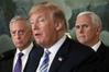 작년 3월 백악관에서 트럼프 대통령의 발언을 듣는 펜스 부통령(오른쪽)과 매티스 당시 국방장관(왼쪽) / (사진=연합뉴스) |