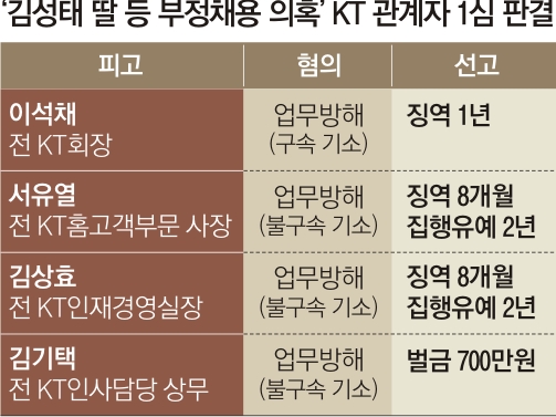 김성태 자유한국당 의원 딸 등 유력 인사의 친인척을 부정채용한 혐의로 재판에 넘겨진 이석채 전 KT 회장이 1심에서 실형을 선고받았다. 재판부가 이 전 회장이 유력 인사의 ‘혜택’을 바라고 채용에 개입한 것을 인정한 만큼 별도로 진행되는 김 의원의 재판에서는 부정 채용을 ‘뇌물’로 볼 수 있을 것인지가 쟁점이 될 전망이다.