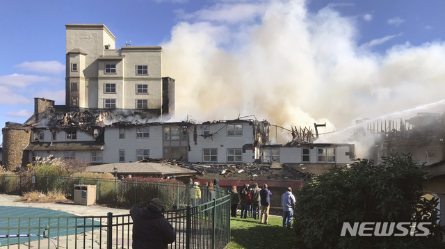 【포코노매너=AP/뉴시스】1일(현지시간) 미 펜실베이니아주 포코노 매너( Pocono Manor)의 포코노 매너 리조트에서 불이 나 구경꾼들이 소방대의 화재 진압을 구경하고 있다. 이 건물은 1902년 퀘이커 교도가 지어 1977년 국가사적지로 지정됐었다. 소방당국은 유서 깊은 이 건물이 화재로 상당 부분 소실됐으며 투숙객은 모두 대피해 인명 피해 보고는 없었다고 밝혔다. 2019.11.02.