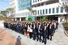 경북농협 도기윤 본부장(맨 앞줄 오른쪽 )이 임직원들과 함께 신사옥 앞에서 첫 출근 기념 사진을 찍으며 파팅하고 있다(경북농협 제공) |