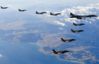 2017년 12월 한·미 연합공중훈련 ‘비질런트 에이스’ 기간에 미국의 장거리 전략폭격기 B-1B 랜서(오른쪽 맨 위)가 한반도 상공에서 한·미 전투기들과 편대비행을 하고 있다. /공군 제공 |