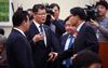 김연철 통일부 장관(왼쪽 두번째)이 7일 오후 국회에서 열린 외교통일위원회 전체회의가 탈북민 송환 문제로 정회되자 윤상현 외통위원장(오른쪽)과 대화하고 있다. /연합뉴스 |
