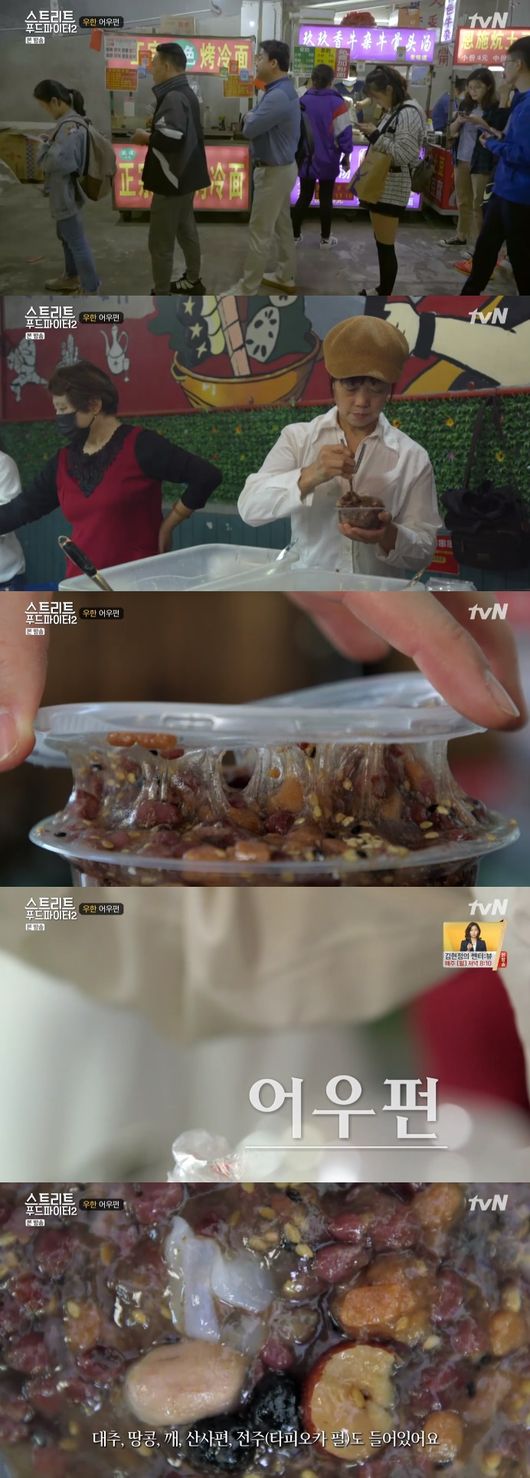 백종원은 "혼자면 조금 억울하다. 이것저것 줄 서서 시켜야하는데 ..혼자 한 줄밖에 서지 못하지 않냐. 하나밖에 못 먹는다"며 아쉬워했다. 백종원은 이곳에서 4위안짜리 어우펀을 주문했다. 백종원은 '어우펀'을 보여주며 "정체불명의 음식이다. 묘하다. 상상했던 맛이 아니다"라며 웃음을 흘렸다.