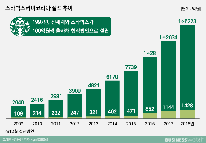 스타벅스커피코리아는 1997년에 정용진 부회장 주도로 신세계가 설립한 회사다. 2000년 미국 본사(스타벅스커피인터내셔널)가 유상증자에 참여해 이 회사 지분 50%를 보유하고 있다. 신세계와 스타벅스가 각각 자본금 100억원을 투입해 만든 합작회사다.