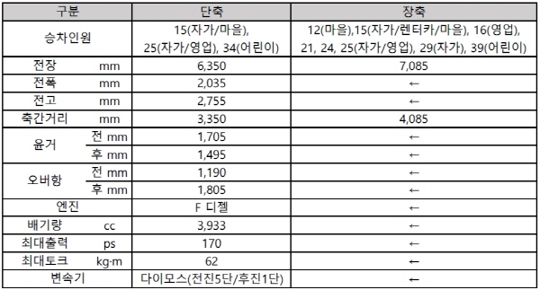 유치원 또는 학원 차량으로 많이 사용되는 만큼 쓰임새에 맞춰 내부 구성을 선택할 수 있는 것도 특징이다. 주문 단계에서 카운티 단축 차량은 어린이 32인+대인2인 구성을 선택할 수 있고, 장축 모델은 어린이 37인+대인2인 시트 구성이 가능하다.