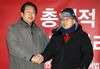 김무성 자유한국당 의원이 21일 오후 서울 청와대 분수대 앞에서 총체적 국정실패 규탄을 위한 단식 투쟁을 하고 있는 황교안 자유한국당 대표를 찾아 악수하고 있다. 뉴시스 |