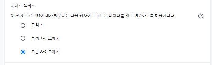 앞서와 달리 ‘모든 사이트에서’에서 액세스 권한을 갖도록 사이트 액세스가 설정되어 있다면, 이는 상시 아무런 제한 없이 브라우저의 모든 것을 보고 수정할 수 있다는 의미이다. 이런 권한이 진짜 필요한지는 고민할 필요도 없다. 당연히 필요 없다고 판단해야 한다. ‘클릭 시’나 ‘특정 사이트’ 중 추가 기능의 성격에 따라 합리적이라고 판단되는 쪽으로 설정을 바꾼다. ‘특정 사이트에서’를 선택하면 해당 확장 프로그램에 액세스 권한을 허용할 특정 사이트를 지정해야 한다. 예를 들어, 지메일 인터페이스를 바꾸는 확장 프로그램이라고 가정하면, mail.google.com에서 작동하도록 설정한다.