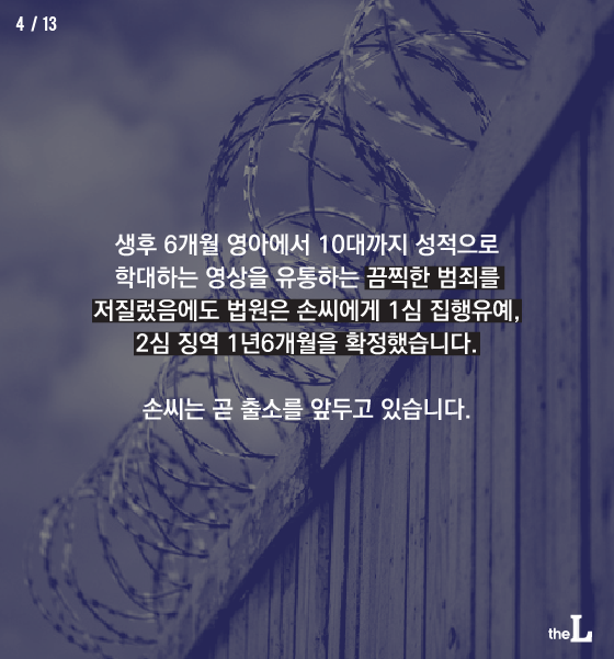 생후 6개월 영아에서 10대까지 성적으로 학대하는 영상을 유통하는 끔찍한 범죄를 저질렀음에도 법원은 손씨에게 1심 집행유예, 2심 징역 1년6개월을 확정했습니다. 손씨는 곧 출소를 앞두고 있습니다.