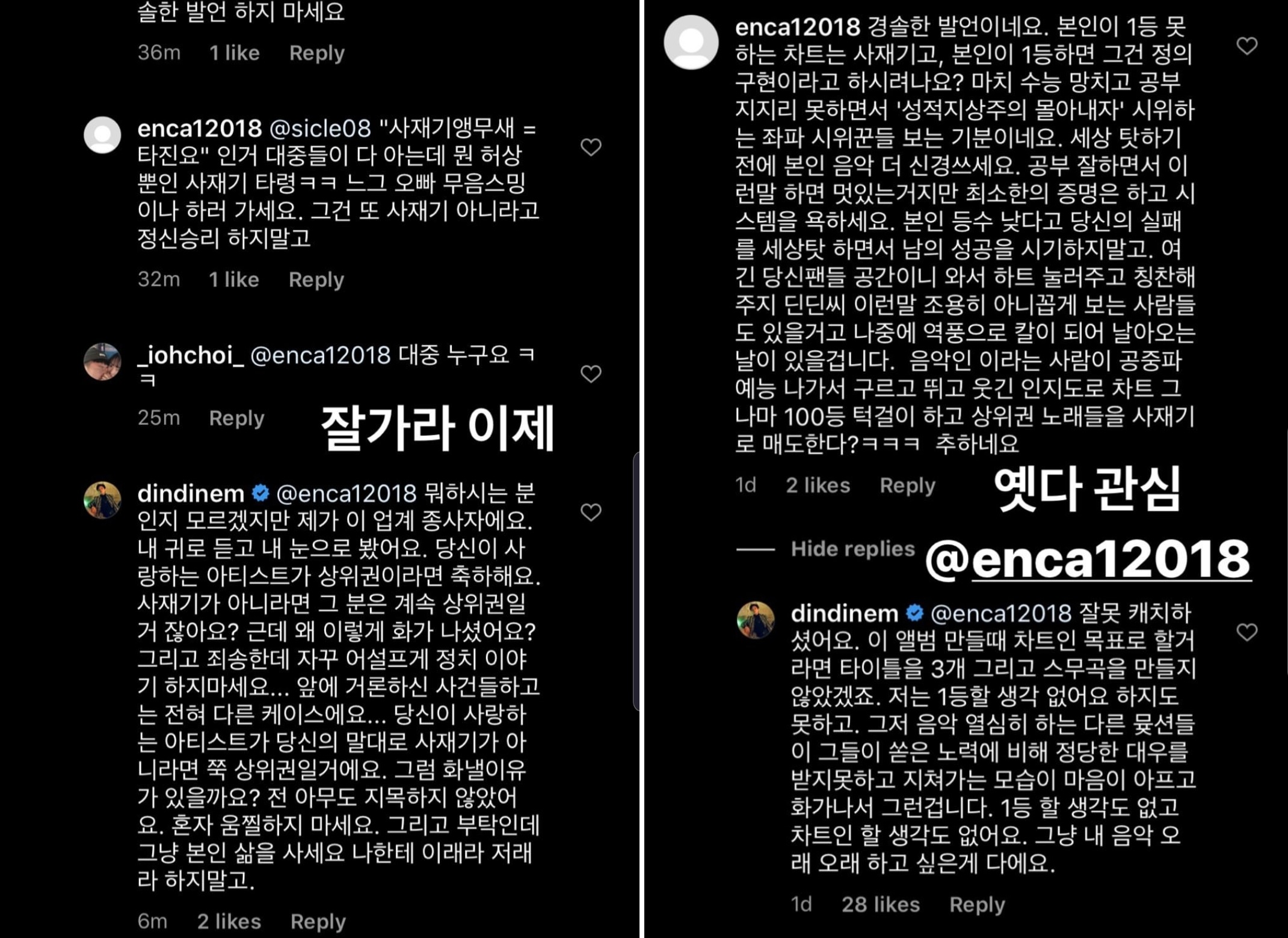 최근 사재기 논란에 대해 언급한 래퍼 딘딘 역시 누리꾼과의 설전에서 비슷한 주장을 펼친 바 있다. 딘딘은 자신을 업계 종사자라고 강조하면서 "내 귀로 듣고 내 눈으로 봤다. 당신이 사랑하는 아티스트가 상위권이라면 축하한다. 사재기가 아니라면 그분은 계속 상위권일 것"이라며 우회적으로 음원 사재기가 존재한다는 사실을 드러내기도 했다.