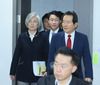 29일 오전 서울 여의도 국회 의원회관에서 열린 일본 수출규제 대응 당정청 상황점검 및 대책위원회 5차 회의에서 정세균 소재부품장비인력발전특별위원회 위원장(오른쪽)과 강경화 외교부 장관, 조정식 정책위의장 등이 입장하고 있다.(사진=연합뉴스) |