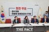 앞서 나 원내대표는 이날 오후 3시 13분에도 같은 장소에서 기자회견을 열고 "오늘 본회의에 상정된 모든 법안에 필리버스터를 신청했다"며 "이 저항의 대장정을 막을 수 있는 것은 불법 패스트트랙(선거·공수처법)의 완전한 철회 선언과 친문 게이트 국정조사 수용"이라고 주장했다.