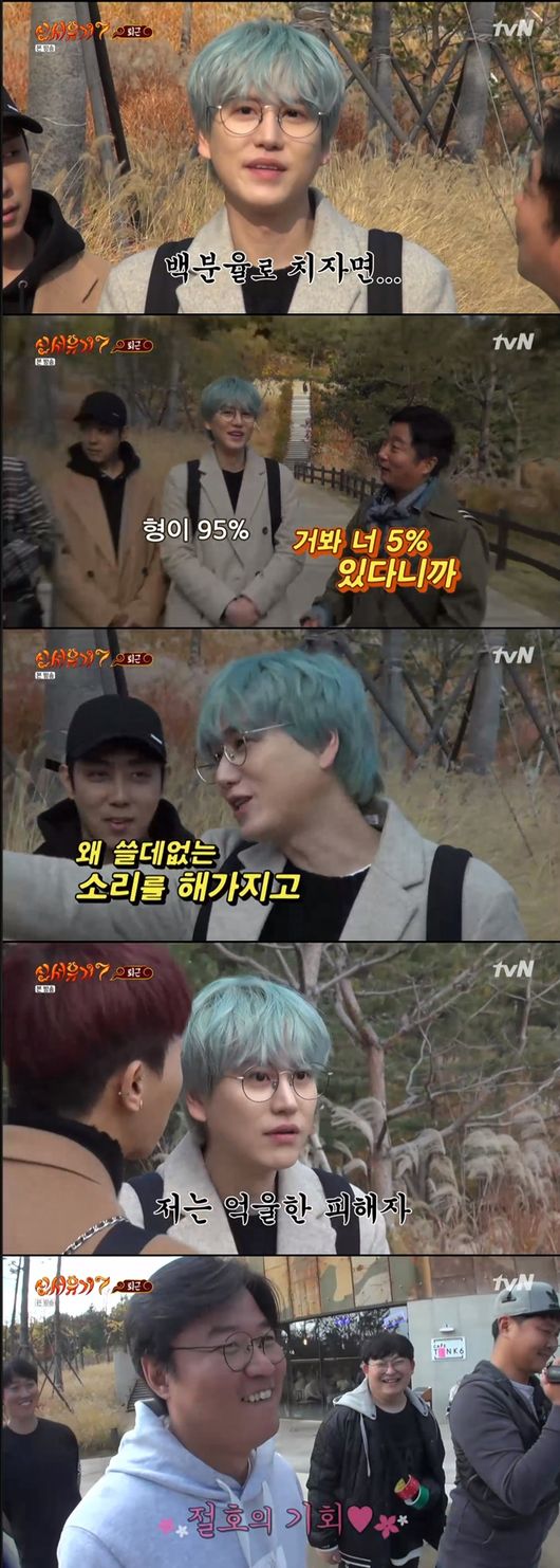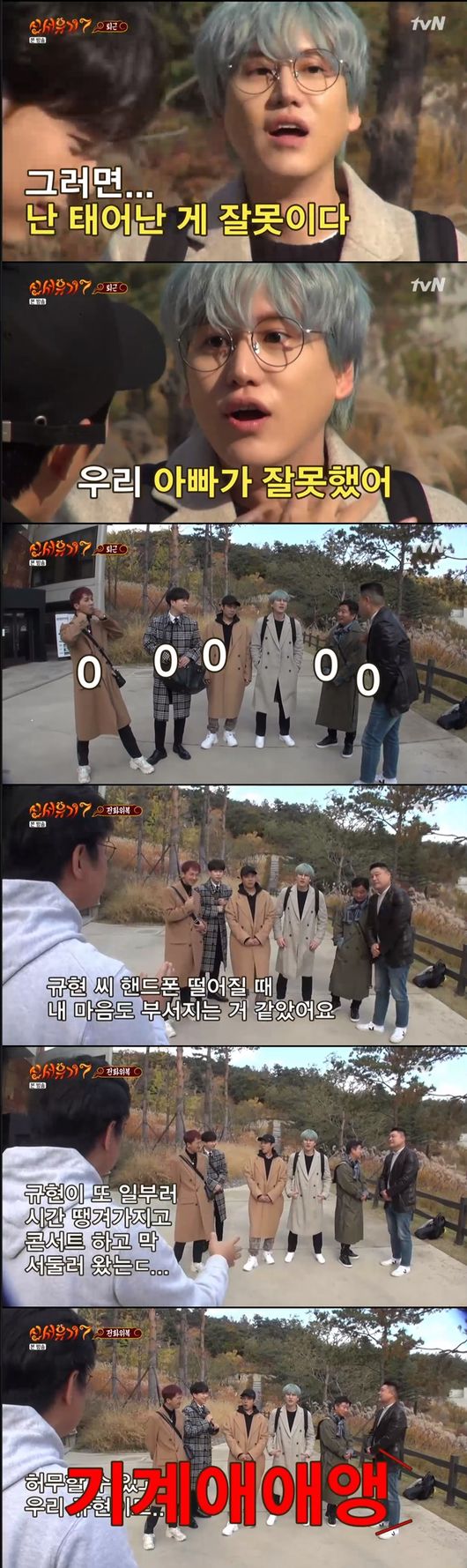 이에 강호동은 "나영석 PD의 눈이 빛나는데 용인에 가서 얘기하면 안되냐"라고 말해 웃음을 자아냈다. 은지원은 그치지 않고 "네가 사진을 찍자고 하지 않았으면 이런 일이 일어나지 않았을 거다"라고 주장했다. 억울했던 규현은 "그렇게 따지면 내가 태어난 게 잘못이다. 우리 아빠가 잘못했다"라고 말해 주위를 폭소케 했다.