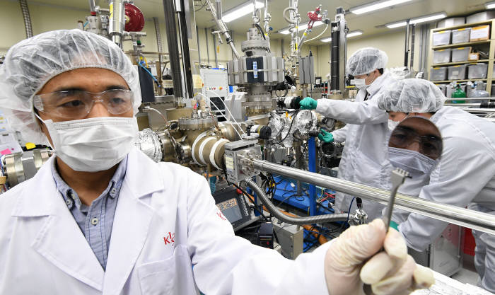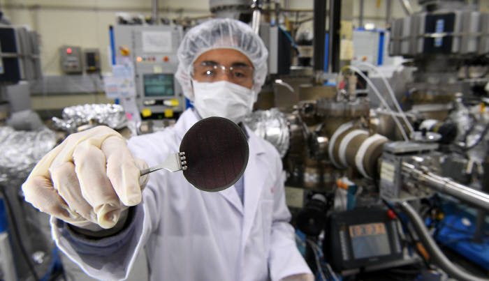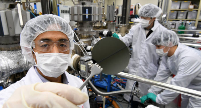 2일 서울 성북구 KIST 차세대반도체연구소에서 연구원들이 '안티몬 Ⅲ-Ⅴ족 화합물 반도체' 기판을 살펴보고 있다.