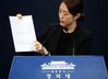 고민정 청와대 대변인이 김기현 전 울산시장 비리 의혹 제보 경위 및 문건 이첩에 관한 브리핑을 하고 있다. 브리핑 중 고 대변인이 고래고기 관련 문건을 들어 설명하고 있다.(사진=연합뉴스) |