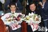 자유한국당 신임 원내대표로 선출된 심재철 의원(왼쪽)과 신임 정책위의장으로 선출된 김재원 의원이 9일 서울 여의도 국회에서 열린 원내대표 경선에서 당선을 확정지은 뒤 의원들에게 인사를 전하고 있다. /사진=뉴스1 |