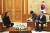 문재인 대통령이 9일 청와대에서 예방한 록밴드인 ‘U2’의 보컬이자 사회운동가 보노 접견에 앞서 인사하고 있다. (사진=청와대) |