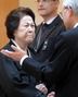 김우중 전 대우그룹 회장의 부인인 정희자 전 힐튼호텔 회장이 10일 경기 수원 아주대학교병원 장례식장에 마련된 남편의 빈소에서 침통한 표정으로 조문객과 이야기를 나누고 있다. 뉴스1 |