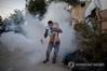 소독 연기가 품어져나오는 그리스 레스보스섬의 한 난민 캠프. [AFP=연합뉴스] |