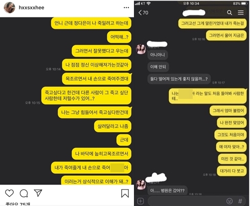 한서희는 12일 자신의 인스타그램에 메시지 캡처본을 공개했다. 이는 한서희가 지인에게 보낸 메시지로 정다은의 위협을 폭로하는 내용을 담고 있다. 그는 지인에게 "정다은이 나 죽이려고 하는데 어떡해?" "목 조르면서 내 손으로 죽여주겠다" 등이라고 말하고 있다. 그러면서 한서희는 자신의 고통을 호소했다. "나는 그냥 힘들어서 죽고 싶다 한 건데" "살려달라고 나 좀" 등 괴로움을 호소하고 있다.