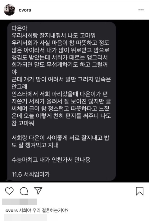한서희 어머니는 한서희에게 "우리 서희 엄마가 많이 사랑해. 다은이랑 사이좋게 놀고 잘 지내렴"이라고 메시지를 보내 눈길을 끌었다. 또한 정다은에게는 "다은아. 우리 서희랑 잘 지내줘서 나도 고마워"라며 "인스타에서 서희 파리 갔을 때 다은이가 편지 쓴 거 서희가 올려서 잘 보이진 않았지만 글씨체며 글이 참 정스럽고 따뜻하다고 느꼈는데 오늘 이렇게 친히 편지를 써주니 나도 참 고마워"라고 전했었다. 그러면서 "서희랑 다은이 사이좋게 서로 잘 지내고 밥도 잘 챙겨 먹고 지내"라고 말해 정다은 역시 "서희야 우리 결혼하는 거야?"라고 덧붙였다.
