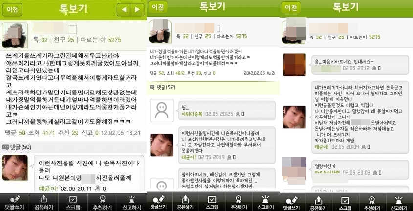 [스포티비뉴스=정유진 기자]'동성 열애설' 의혹이 이번에는 '데이트 폭력' 의혹이 됐다. 아이돌 연습생 출신 한서희가 '얼짱시대' 출신 정다은이 데이트 폭력을 가했다고 주장해 충격을 안기고 있다. 이런 가운데, 정다은이 과거 여자친구와 헤어지고 협박한 듯한 댓글이 재조명되고 있다.