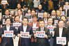 자유한국당 황교안 대표와 심재철 원내대표 등 의원들이 지난 12월 11일 국회에서 열린 의원총회에서 손팻말을 들고 “세금 도둑 민주당, 예산 날치기 문희상”을 외치고 있다. <연합뉴스> |