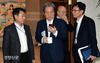 16일 오후 청와대에서 열린 수석·보좌관 회의에 앞서 윤도환(왼쪽부터) 국민소통수석, 노영민 비서실장, 김상조 정책실장이 핸드폰을 보며 대화하고 있다.뒤는 김조원 민정수석./청와대사진기자단 |