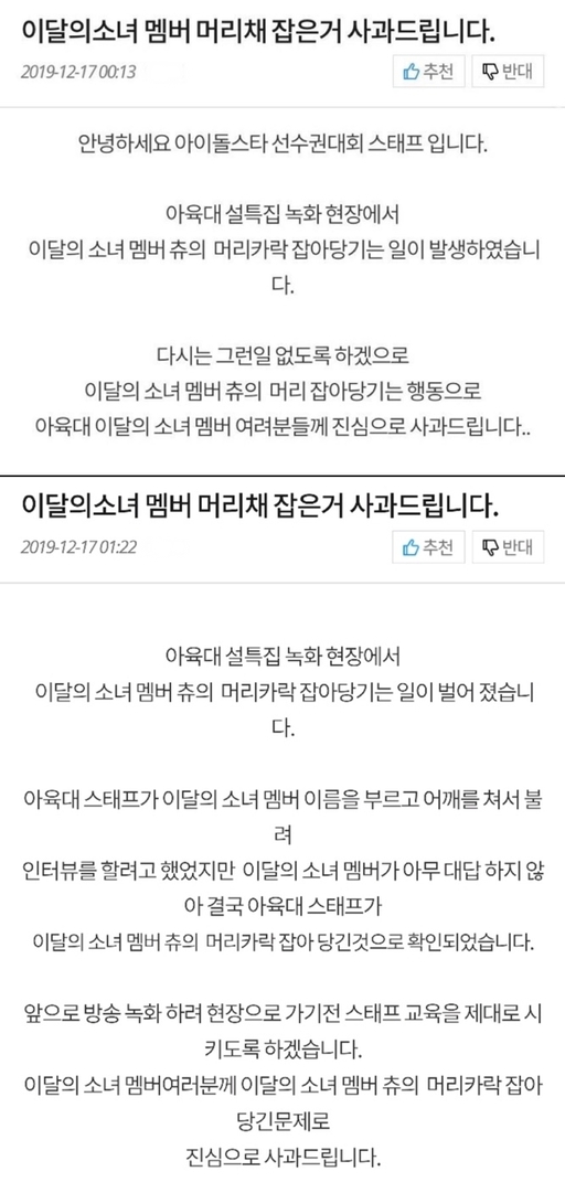 먼저 스태프는 ‘이달의 소녀 멤버 머리채 잡은 거 사과드립니다’라는 글을 게재했다. 스태프는 “다시는 그런 일 없도록 하겠다”며 “이달의 소녀 멤버들에게 진심으로 사과한다”고 적었다.