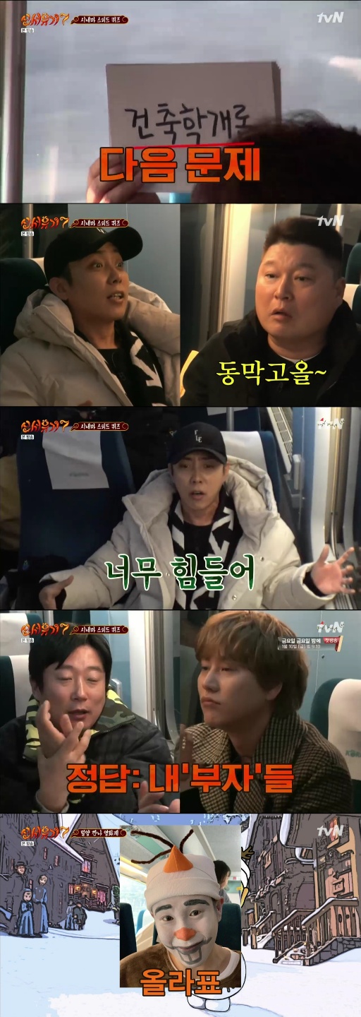 수근, 규현 팀에서 출제자인 이수근은 ‘청년 경찰’ 문제를 설명했다. 이수근은 “강하늘을 체포하는 거다”라며 다소 엉뚱한 설명을 했다. 그럼에도 조규현은 이를 맞히며, 파죽지세로 문제를 풀어나갔다. 이수근은 ‘내부자들’을 설명하며 손목을 돌렸다. 하지만 조규현은 이를 캐치하지 못하고 결국 패스를 외쳤다. 강호동은 이에 은지원을 흔들며 “우리 희망이 있다”고 기뻐했다. 결국 수근, 규현 팀이 꼴찌를 했다.