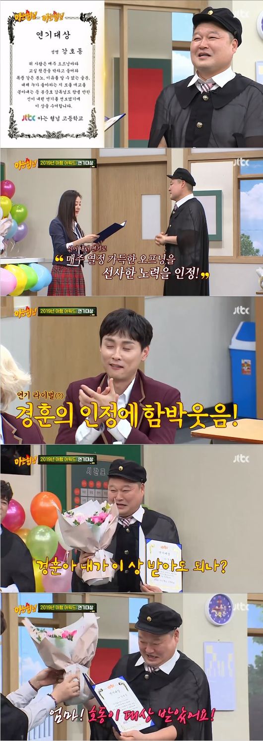 이어 '호프닝'(호동이 오프닝)으로 호동이 지목 됐고 "여기서 연기는 사실 제일 많이 하지"라면서 서장훈이 공감했다. 이에 김희철이 "사실 나도 재연은 진짜 많이 해"라고 하면서 영화나 드라마의 장면들을 재연 했음을 설명 했다. "근데 최우수상도 아니고 진짜 대상이야?"라는 영철의 질문에 이어 오나라가 대상을 시상했다. "축하드립니다 강호동" 이라는 말에 이어 "오프닝 연기의 대가 강호동"이라는 장성규의 말이 이어졌다. "옛날에는 안받는 게 이상했는데 요즘에는 받는 게 이상하잖아"라면서 수근이 그를 축하 했다. "경훈아 미안하다"면서 호동이 울먹거렸다.