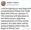 트럼프 대통령은 이밖에 "나중에 나는 2단계 회담이 시작되는 베이징으로 갈 것"이라며 중국 방문 계획도 밝혔다.