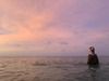 사진 속 이엘리야는 보라색 하늘을 바라보며 바다 한가운데 서있다. 이엘리야는 머리에 꽃을 달고 청순한 분위기를 자아낸다.
