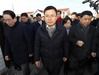 자유한국당 황교안(가운데) 대표가 2일 오후 경북 포항시 북구 흥해읍 지진피해 이재민 주거단지를 방문하고 있다./연합뉴스 |
