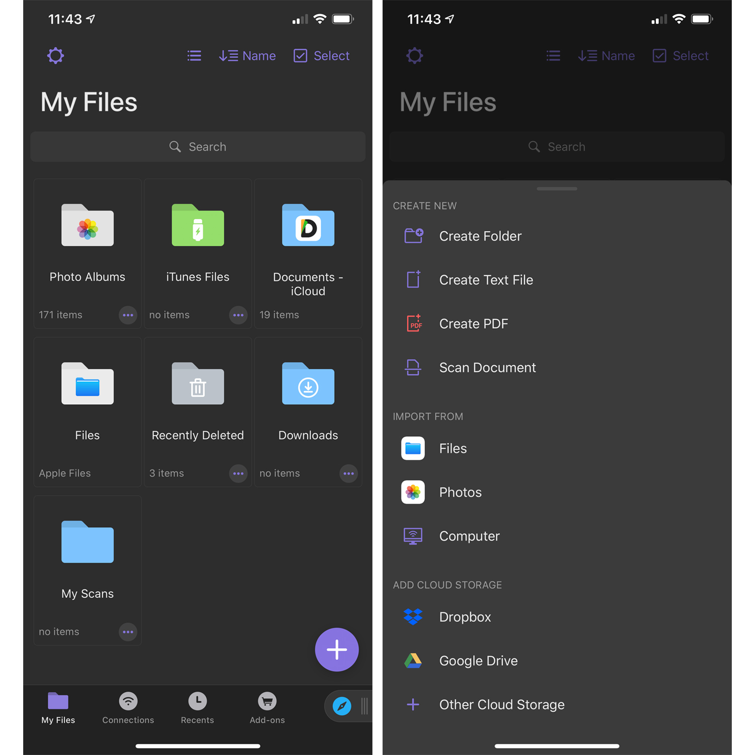 화면 오른쪽 아래에 위치한 플러스 버튼으로 사용자는 빠르게 새 폴더, 텍스트, PDF 파일을 생성하고, 문서를 스캔하거나 아이클라우드 드라이브, 사진, 클라우드 스토리지, NAS 등의 파일을 가져올 수 있다. 내장된 파일 앱과 통합되어 여기에 저장된 콘텐츠에 끊김 없이 액세스할 수 있다.