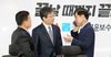 새로운보수당 하태경 책임대표(오른쪽부터)와 유승민 보수재건위원장, 정운천 정책위의장이 7일 오전 서울 여의도 국회 의원회관에서 열린 당 대표단 회의에 참석해 대화를 나누고 있다. (사진 = 연합뉴스) |