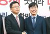 황교안 자유한국당 대표(왼쪽)가 7일 오후 국회에서 하태경 새로운보수당 책임대표 예방을 받고 악수를 하고 있다. [김호영 기자] |