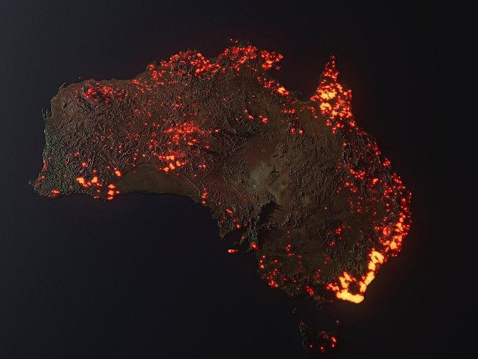 지난 7일(현지시간) 호주 언론은 현지 산불을 한눈에 볼 수 있는 이미지 한 장을 보도했다. 이 이미지는 브리즈번에서 활동하는 사진작가이자 그래픽 디자이너인 앤서니 허시의 그래픽 작품이다. 그는 미 항공우주국(NASA)의 화재관측위성(FIRMS)이 지난해 12월 5일부터 지난 5일까지 한달 동안 촬영한 호주 산불 데이터를 활용해 일반인들이 보기 편하게 3D로 구현해 제작했다.