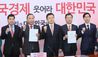 자유한국당 박덕흠, 이양수 의원 등이 9일 국회에서 최고위원회의에서 황교안 대표에게 '당혁신 동참 일임서'를 전달한 후 기념촬영 하고 있다./연합뉴스 |