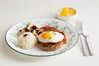 6. 달군 팬에 햄버거 패티를 얹고 밥, 버섯볶음, 달걀 프라이를 곁들인다. |
