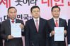 자유한국당 박덕흠(왼쪽), 이양수(오른쪽) 의원이 9일 국회에서 최고위원회의에서 황교안 대표에게 ‘당혁신 동참 일임서’를 전달한 후 기념촬영 하고 있다.(사진 = 연합뉴스) |