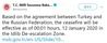 터키 국방부는 10일(현지시간) 트위터를 통해 "러시아 연방과의 협정에 따라 2020년 1월 12일 오전 0시 1분부터 이들립 긴장완화지역에서 휴전이 발효된다"고 발표했다.