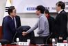 자유한국당 김태흠 의원이 13일 오후 서울 여의도 국회 의원회관에서 열린 '혁신을 통한 보수 대통합, 어떻게 할 것인가?' 토론회에서 새로운보수당 이준석 젊은정당비전위원장을 비롯한 참석자들과 인사를 나누고 있다.