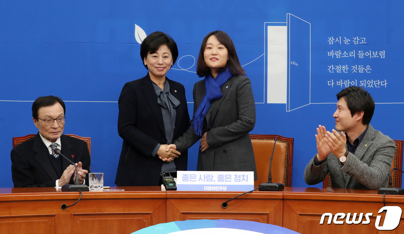 (서울=뉴스1) 박세연 기자 = 14일 오전 서울 여의도 국회에서 열린 더불어민주당 인재영입발표에서 남인순 최고위원이 환경전문변호사 이소영씨에게 파란머플러를 둘러주고 있다. 2020.1.14/뉴스1 psy5179@news1.kr[© 뉴스1코리아(news1.kr), 무단 전재 및 재배포 금지]