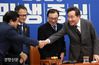 국무총리직을 마치고 더불어민주당으로 복귀한 이낙연 전 국무총리(오른쪽)가 15일 당 대표실에서 이해찬 대표(오른쪽에서 두번째) 등과 인사를 나누고 있다. 김영민 기자 |